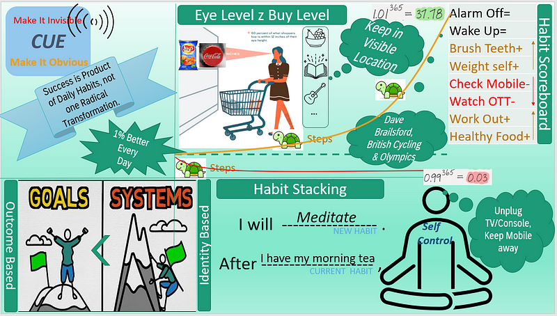 - Keep a habit scoreboard with good, bad, and neutral habits to track behaviour and try to increase the count of good habits in that scoreboard.