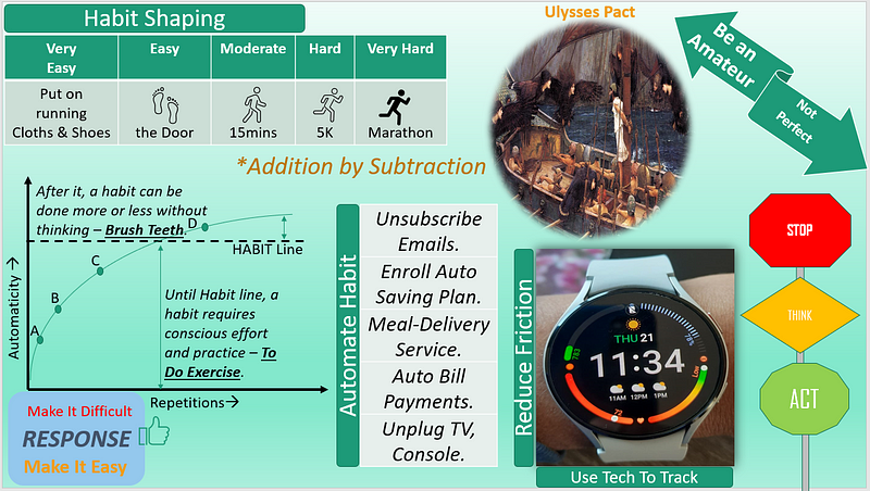 - Reduce the friction to make good habits easy and vice versa. Choose a gym close to home/office, use Tech to track activities, etc.