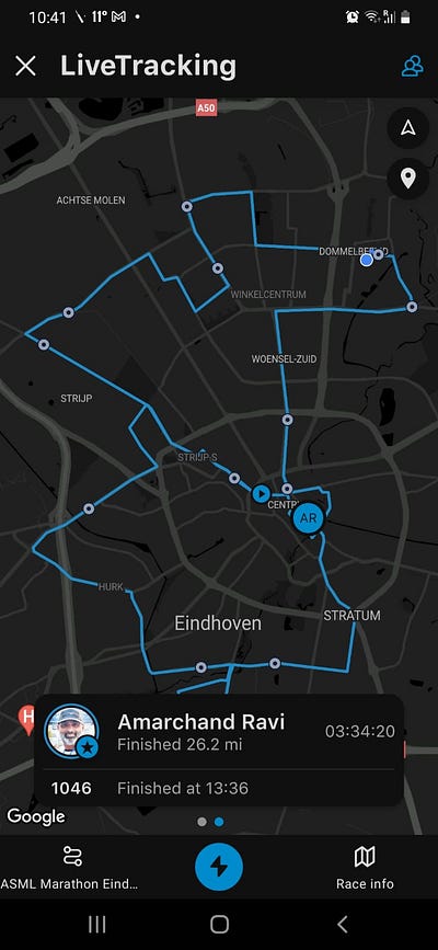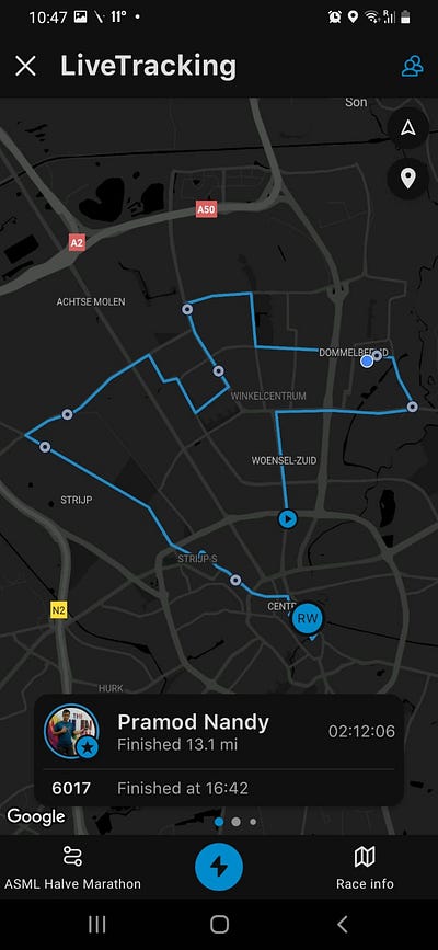 Started good and finished 5KM with PR. I started feeling the heat as I wore a winter full sleeve T-shirt to avoid the cold. But it was the wrong decision. Eventually completed 10KM in 55 minutes. Then 15KM and slowly 21KM. At some point in between 17–21KM, I felt pressure and was running at the slowest speed. But the crowd toward the finish line was great, which pushed me to the finish line to become a Half-Marathon finisher. I was surprised and felt lucky to be featured in the ASML Marathon Eindhoven 2022 video. Thanks to all runners, mentors with whom I crossed path during this journey.
