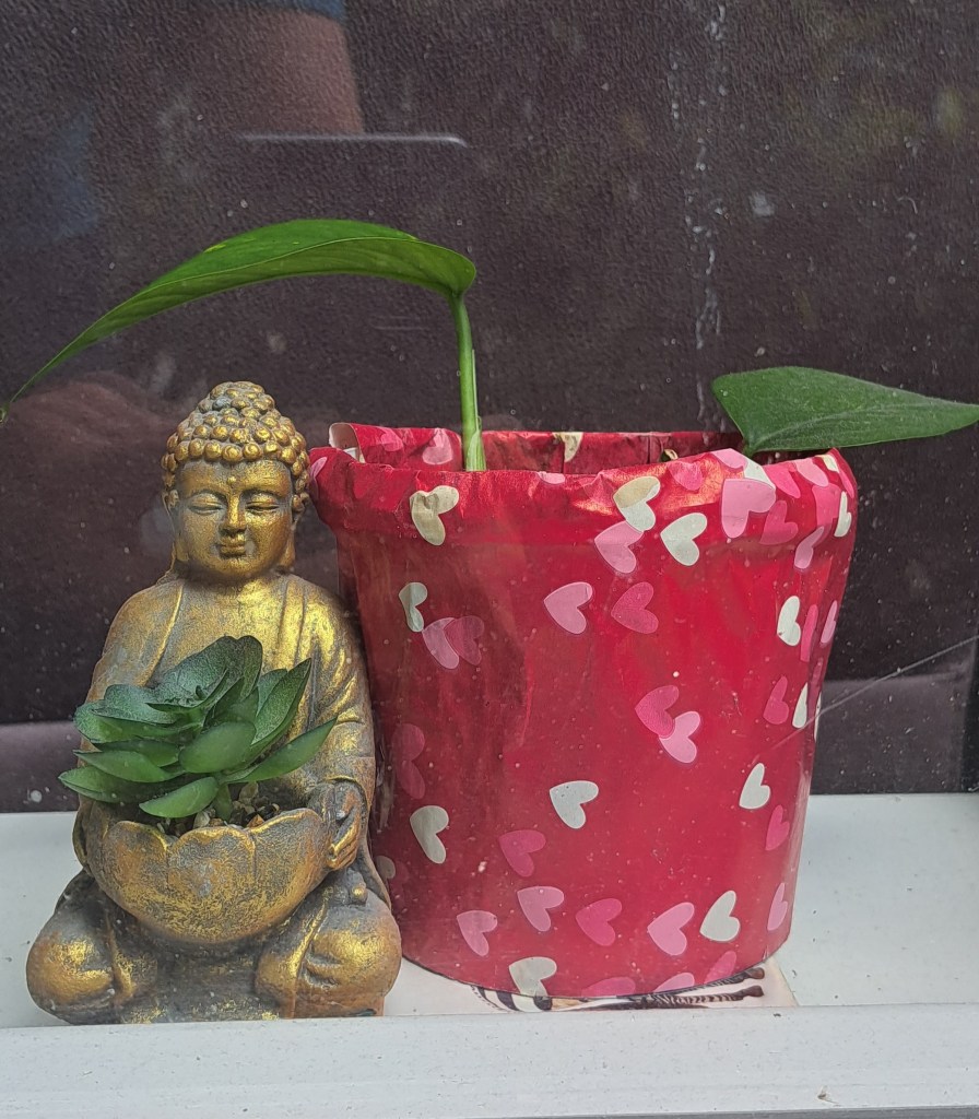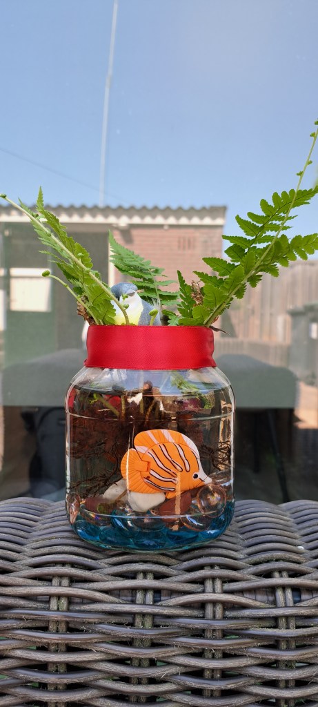 One fine morning, we had bread with jam as breakfast and found another would be empty bottle. We cleaned it. Kept same marbles which we collected from beach. Put the toy fish in that bottle and filled with water. Found one house plant close to our house and added that to this new flower pot. No rocket science in this but just to connect similar unused items to give new meaningful form.