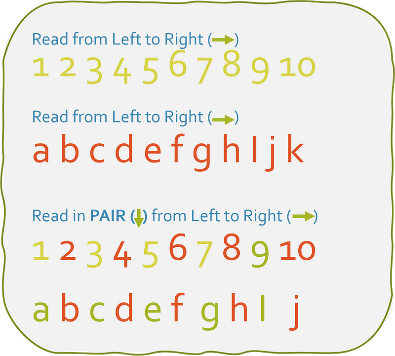 Let’s check with the below simple reading exercise. Read first (i.e. numbers) and second (i.e. characters) row one after another, note down the time spent. Then read in pairs in memory, not looking into the picture and note down the time spent. Can you comment which one takes more time?