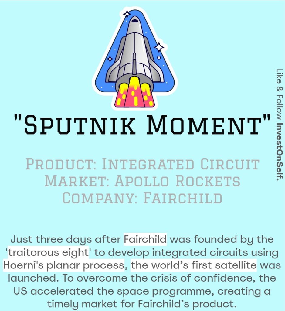 Eight engineers left Shockley Labs, the first high-tech company, for its toxic environment and founded a startup, Fairchild Semiconductor, with seed funding to fabricate ICs with Hoerni’s planar process. ICs take less space, consume less power and are more reliable than vacuum tubes but were estimated to be more expensive. Three days after the foundation, the world’s first satellite, Sputnik, was launched by the Soviet Union. To overcome the crisis of confidence and keep scientific dominance, the US launched the space programme, and the company had a market for its product.