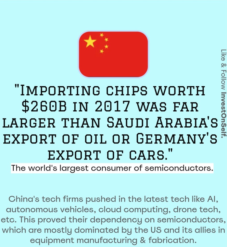 China’s tech firm has seen explosive growth in hardware sectors like autonomous vehicles, mobile and its part manufacturing, drone tech, etc. This led to more spending on the import of chips ($260 billion) than oil (around $162 billion). So the Chinese government created a strategic goal to reduce the import costs and to focus on building indigenous fabrication and equipment manufacturing, which is currently dominated by Taiwan and South Korea for the former and Japan, the Dutch, and the US for the latter.