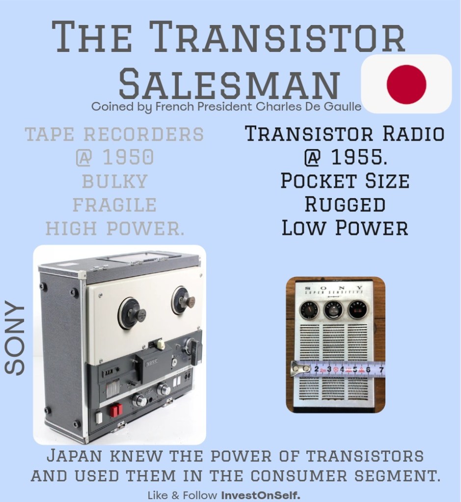 In 1962, the then Japanese PM Ikeda went to France for the first time after the war and gifted a transistor radio to the then French president De Gaulle. The French president was impressed by the state-of-the-art product and mentioned his counterpart as “the transistor salesman”.