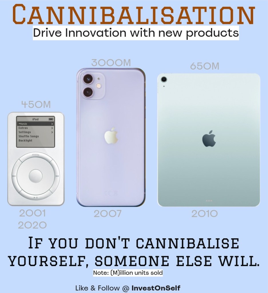 As the company, Apple, pushes innovation and launches new products and services, it risks cannibalising the sales of its existing products. Steve was never reluctant about it; instead, he prioritised product- and service-driven innovation.