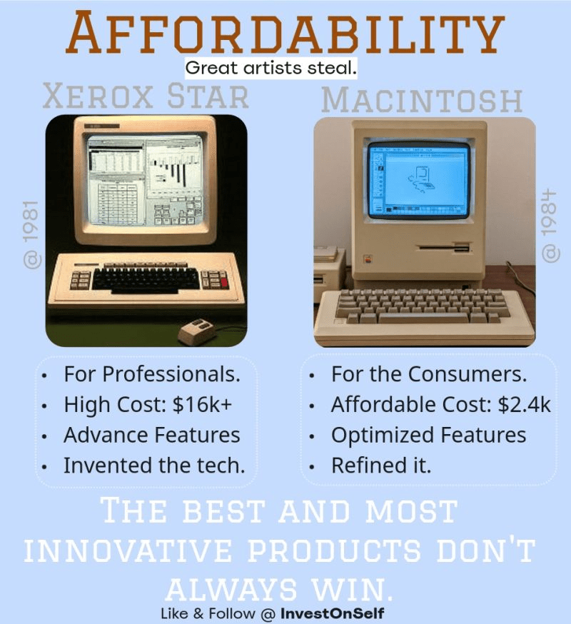 On their return to the Apple office, Steve asked the team, “We have got to do this, and how long will it take to implement?” And in 1984, the launch of the Macintosh, with fewer and refined features with an affordable price tag, was a revolutionary success, unlike the Xerox Star, which invented the technology.